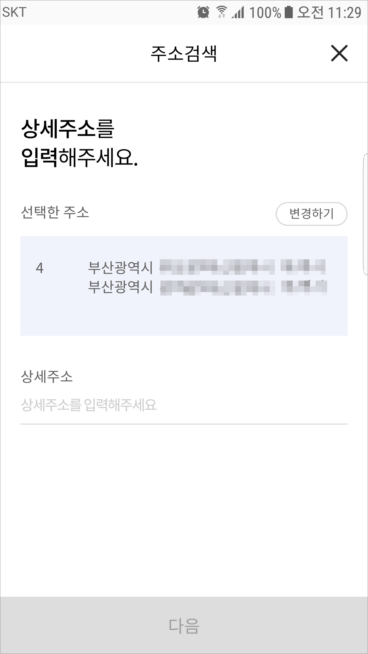 아래 사진처럼, "상세주소"를 입력하지 않을 경우 "다음" 버튼이 활성화되지 않습니다.