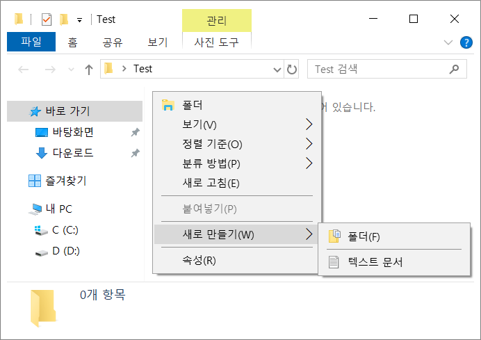 마우스 오른쪽 메뉴에 메모장을 추가하면 바로 텍스트 문서를 작성할 수 있습니다.