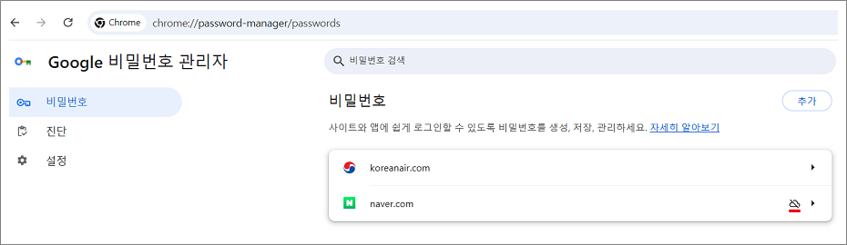 이 기기에만 저장된 비밀번호는 네이버, Google 계정에 저장된 비밀번호는 대한항공으로 총 2개의 비밀번호가 저장된 상태입니다.