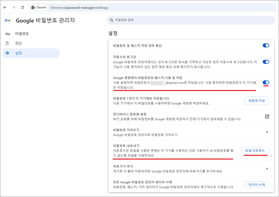3. 크롬에만 저장된 비밀번호만 내보내기 위해서는 "Google 계정에서 비밀번호와 패스키 사용 및 저장" 설정이 왼쪽으로 꺼져 있어야 합니다.