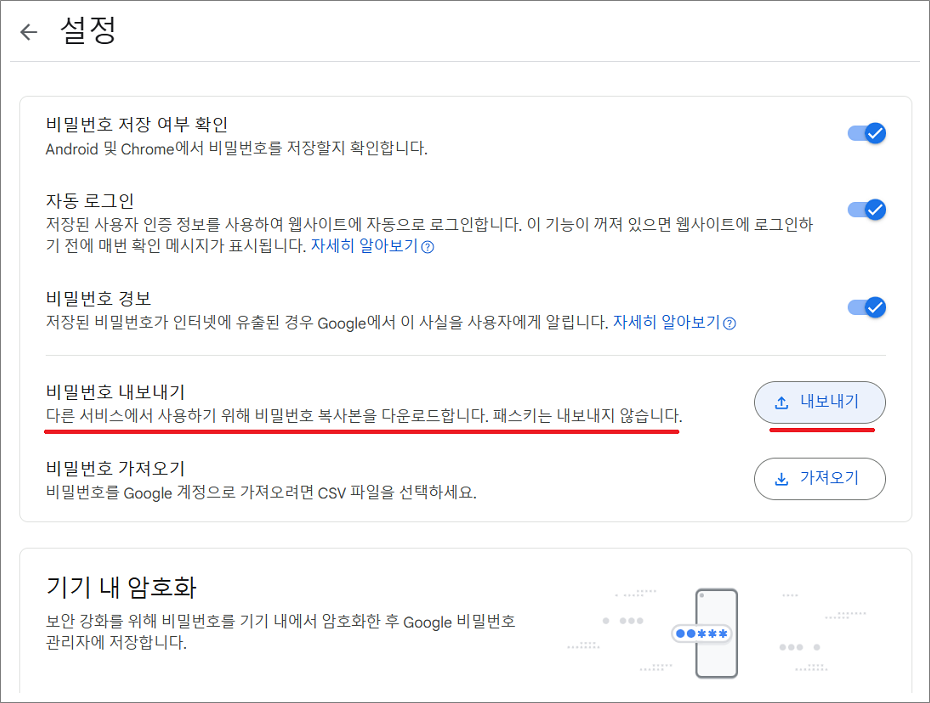 구글 크롬 비밀번호 내보내기는 이 기기에 저장된 비밀번호 내보내기 방법과 구글 계정에 저장된 비밀번호 내보내기 방법이 조금 다릅니다.
