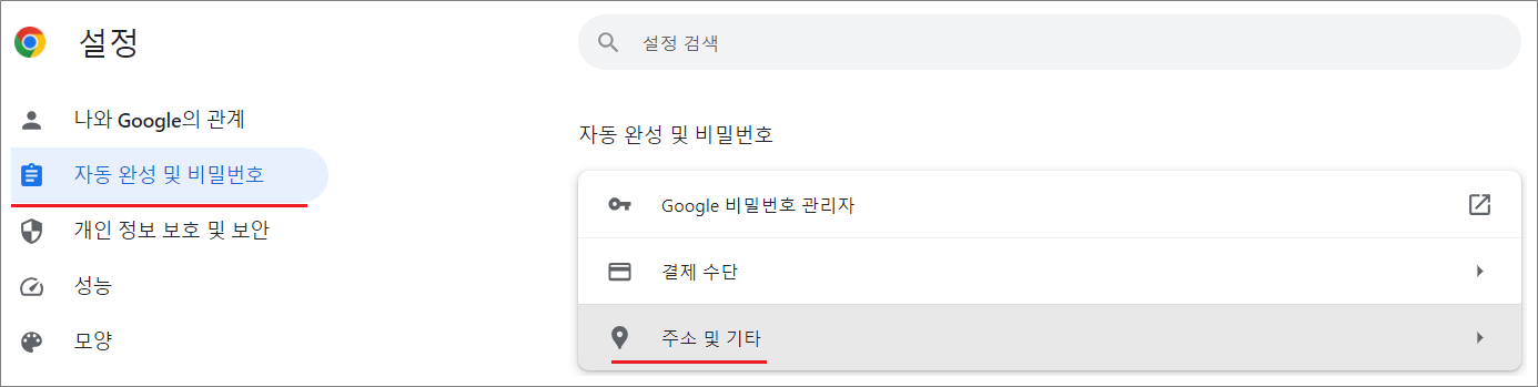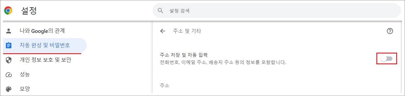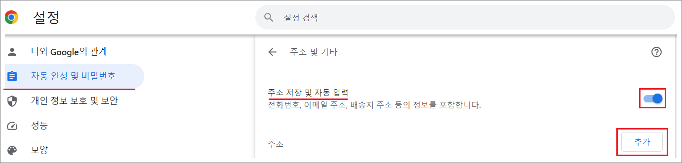 구글 크롬 자동완성 끄기는 주소 저장 및 자동 입력에서 끄기와 켜기를 설정할 수 있습니다.