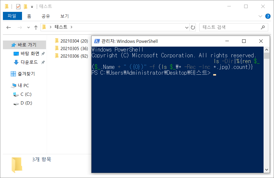 ④. ls -Dir|%{ren $_ ($_.Name + " ({0})" -f (ls $_\* -File -Inc *.jpg).count)} 붙여넣기 해서 엔터를 치면 자동으로 폴더 이름이 폴더 안의 파일 개수만큼 표시되면서 폴더 이름 자체가 "20210304"에서 "20210304 (10)" 등으로 일괄적으로 변경됩니다.