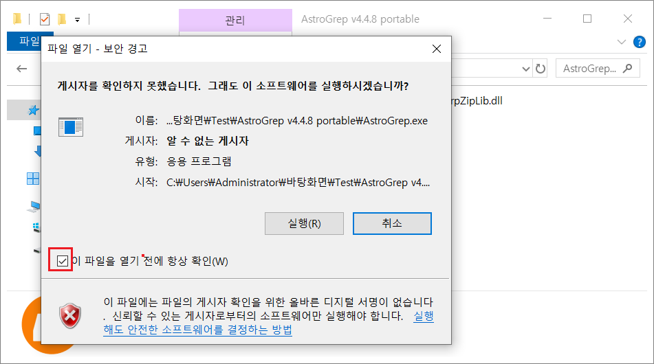 ③. AstroGrep.exe 실행하기 전에는 보안 부분 차단 해제가 있습니다.
