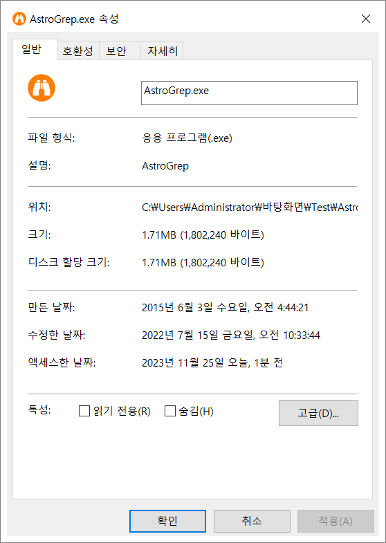 ④. 보안 부분에 체크하지 않고 실행하면 Microsoft Defender SmartScreen 나오지만 자동으로 AstroGrep.exe 속성에서 보안 부분이 없어지기 때문에 다시 실행하면 Microsoft Defender SmartScreen 나오지 않습니다.