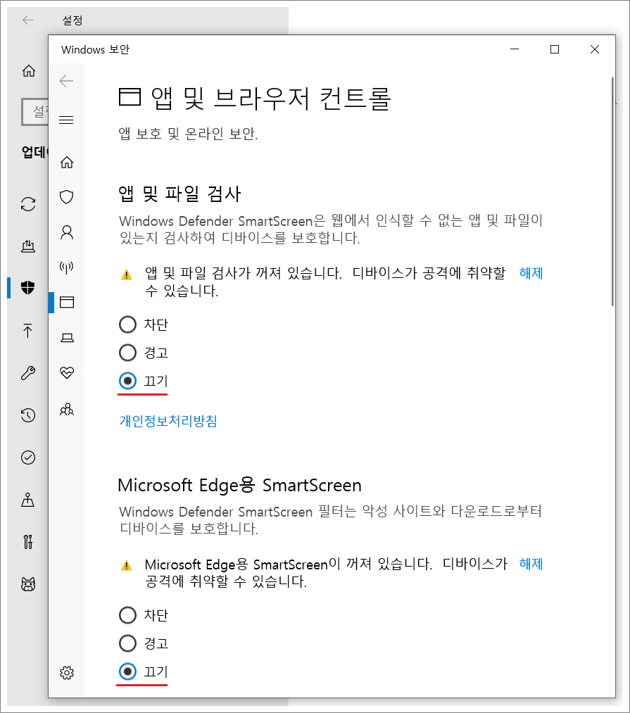 윈도우 설정에서 Microsoft Defender SmartScreen를 해제해도 별의미가 없습니다.