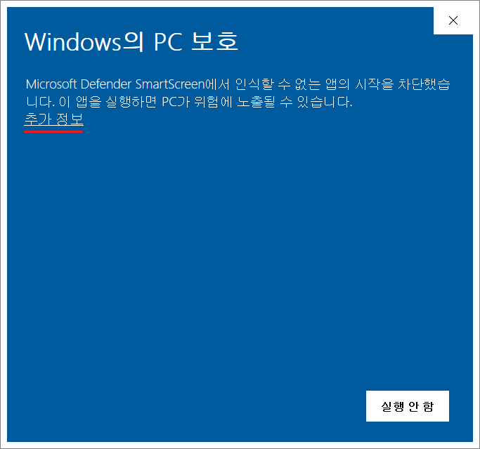 Microsoft Defender SmartScreen 한번 실행하면 두 번 이상 나오지 않으니 그냥 실행하는 것이 좋습니다.