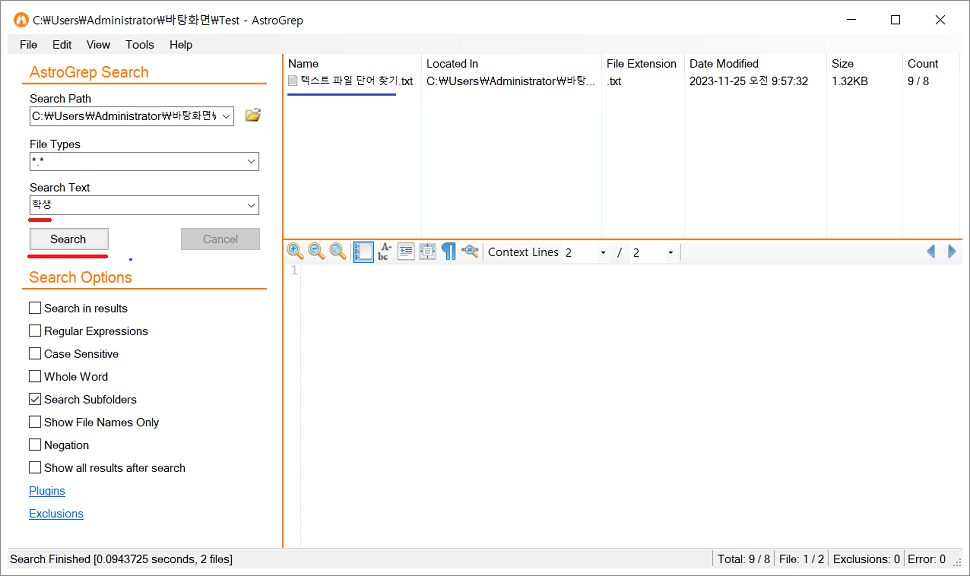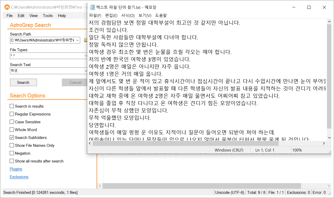 Count 9/8 의미는 9개의 "학생" 단어를 찾았고 1개는 한 줄에 학생 단어가 2개 들어있다는 의미입니다.