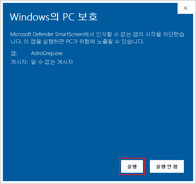 Microsoft Defender SmartScreen에서 인식할 수 없는 앱의 시작을 차단했습니다. 이 앱을 실행하면 PC가 위험에 노출될 수 있습니다. 윈도우에서 프로그램을 실행하면 한 번씩 위와 같은 메시지가 나오는