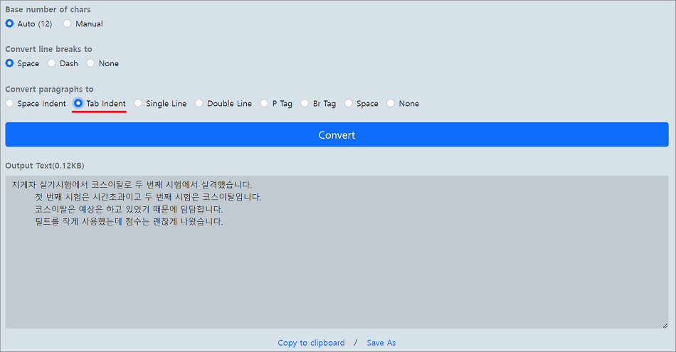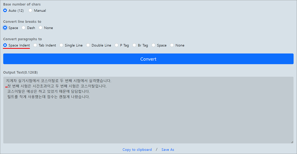 ②. 기본 설정인 Space Indent 방식은 문장 앞에 띄어쓰기가 삽입됩니다.