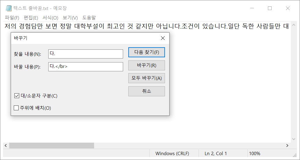 ②. "다."를 "다.<br>" 또는 "다.<br><br>" 로 모두 바꾸기 하면 됩니다.