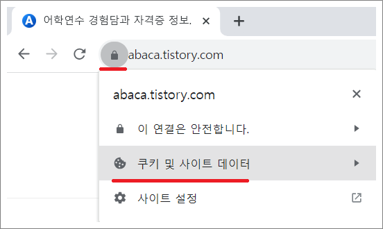 ①. 쿠키 및 테이터를 삭제하고 싶은 사이트에 접속합니다.