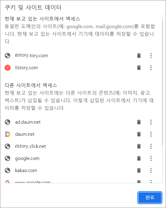 ④. 해당 사이트의 쿠키 및 사이트 데이터가 삭제된 모습입니다.