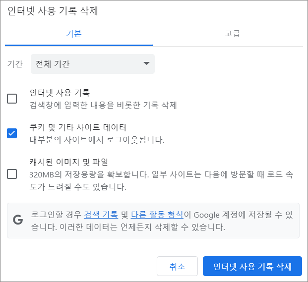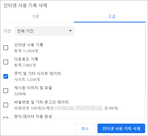 구글 크롬 쿠키 및 사이트 데이터는 일반적으로 인터넷 기록 삭제 메뉴에서 전체삭제를 합니다.