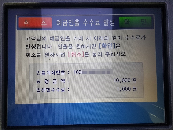 ⑩. 국민은행 KB모바일현금카드를 신한은행 ATM를 이용했기 때문에 수수료는 1,000원입니다.