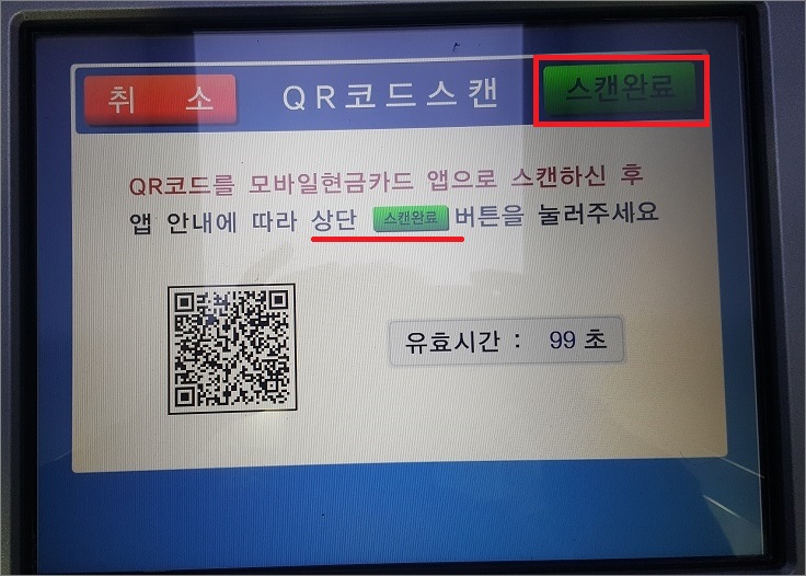 ⑦. QR코드 스캔이 완료되면, ATM에서 스캔완료 선택.