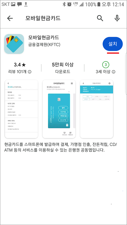 ①. Play 스토어에서 모바일현금카드 검색해서 설치합니다.