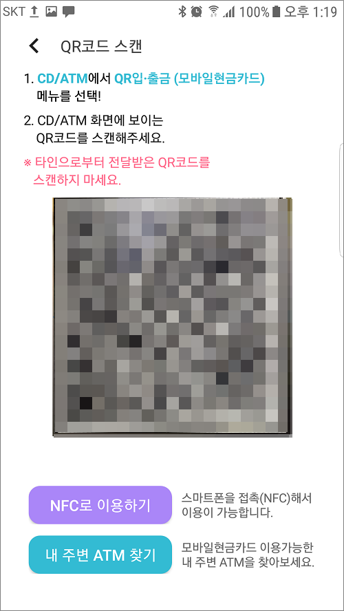 ④. 모바일현금카드 실행해서 QR코드로 인증. 유효시간은 100초입니다.