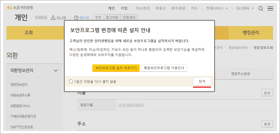 국민은행 KB국민인증서 로그인한 경우 영문이름 확인은 보안프로그램은 설치하지 않아도 됩니다.