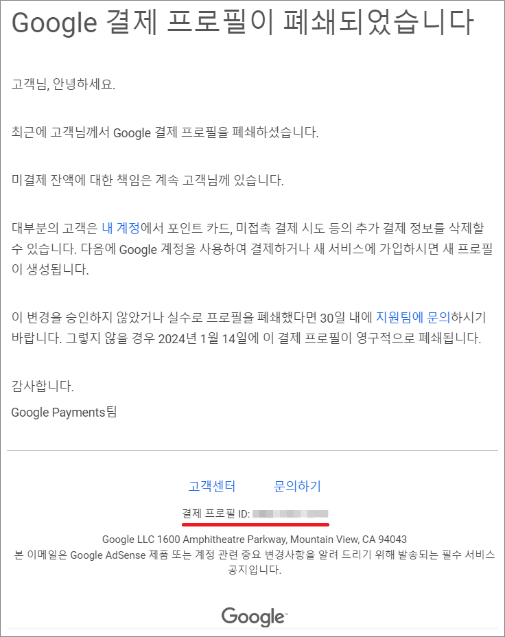 ④. 구글 결제 프로필 폐쇄가 완료되면 폐쇄 완료 이메일이 옵니다.