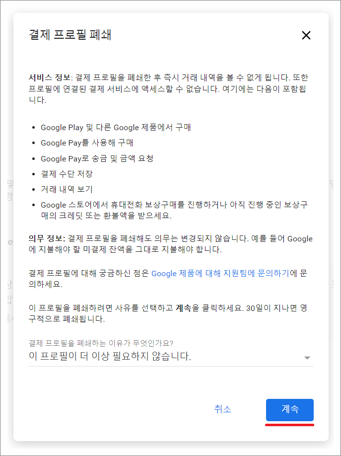 3. 구글 결제 프로필 삭제 또는 폐쇄.