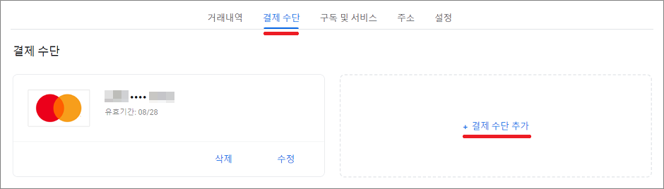 ①. 구글 결제 프로필 결제 수단 추가를 선택하면 다른 신용카드 또는 체크카드를 추가할 수 있습니다.