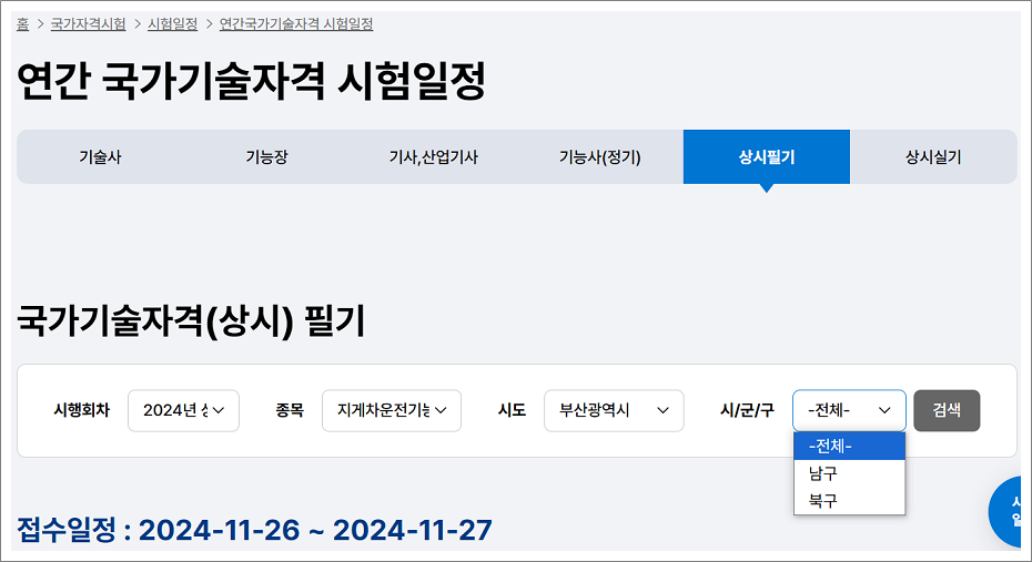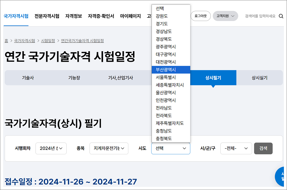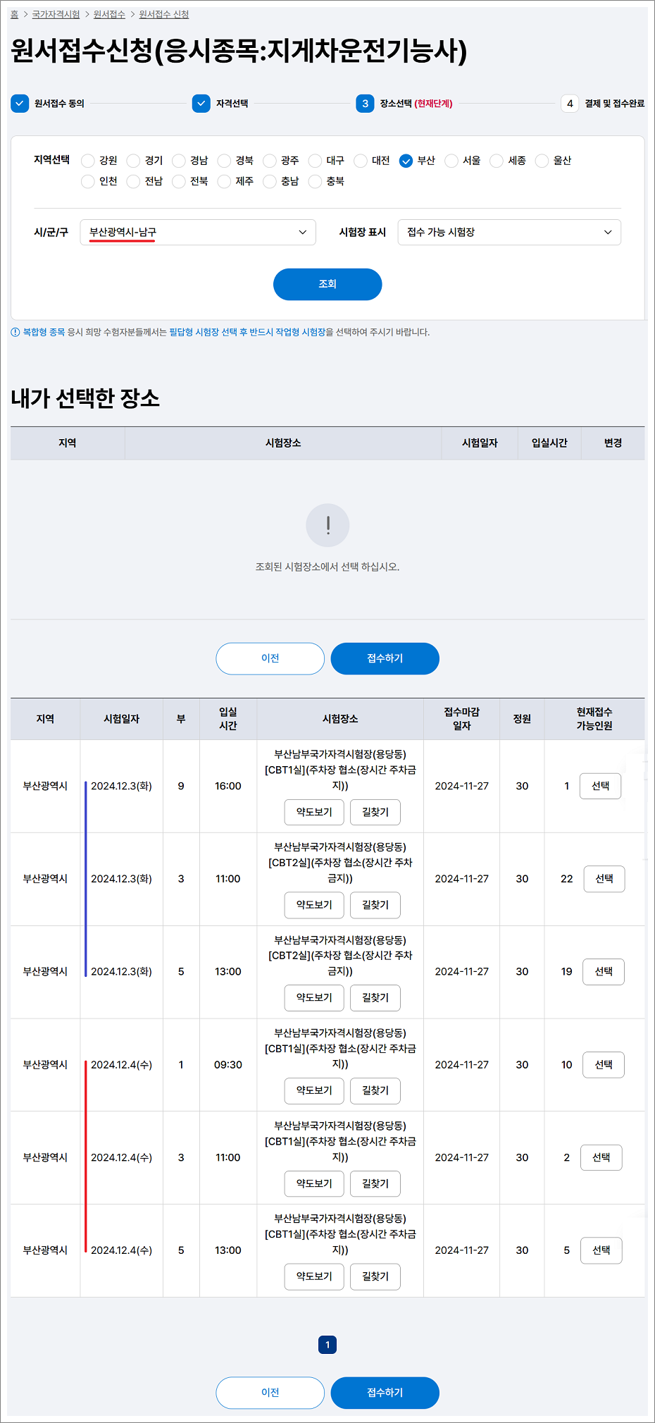 전국 지게차 필기시험 기간은 12월 2일 ∼ 6일이지만 부산 경우는 12월 3일 ~ 4일까지 2일 기간만 필기시험을 시행합니다.