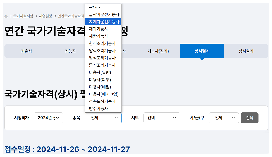 지게차운전기능사 필기시험은 12월 2일 ∼ 6일까지 모든 날짜에 필기시험을 치르는 것이 아닙니다.