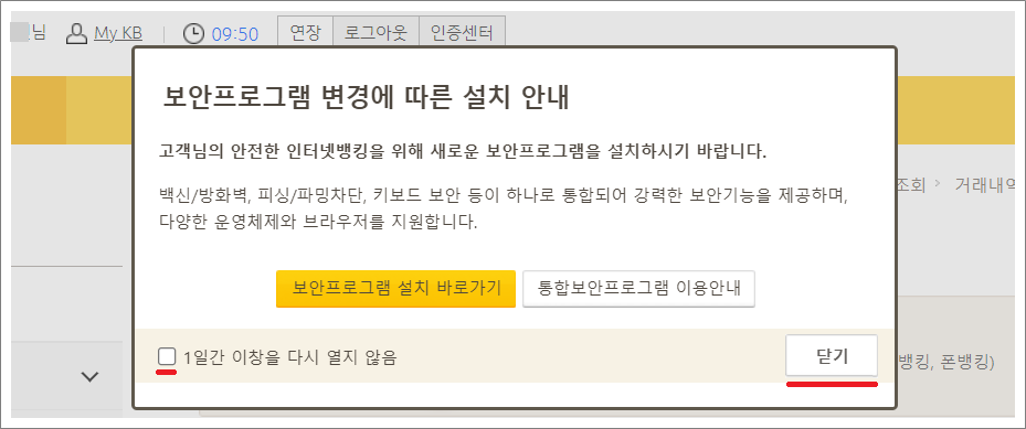 보안프로그램 설치가 필요 없는 경우는 체크하고 닫기 하면 됩니다.