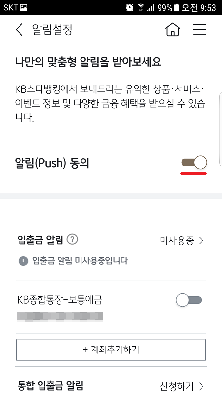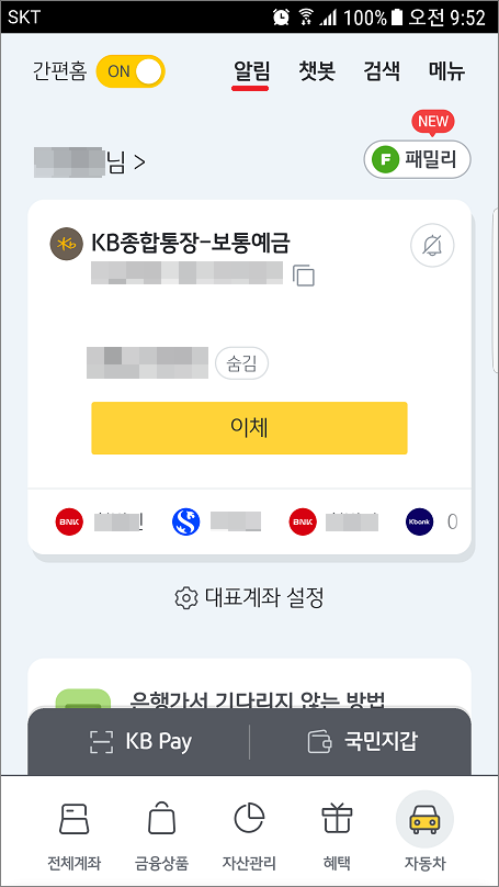 ④. KB스타뱅킹에 접속해서 알림 선택.