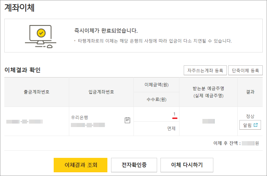 ⑤. 확인 선택하면 PC에서 자동으로 이체가 됩니다.