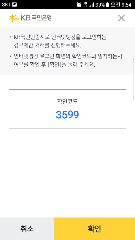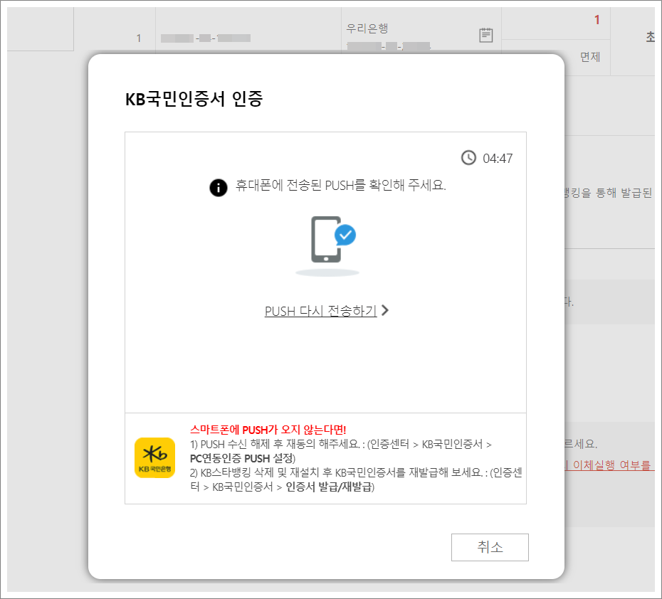 국민은행 계좌이체는 KB국민인증서 인증이 필요합니다.