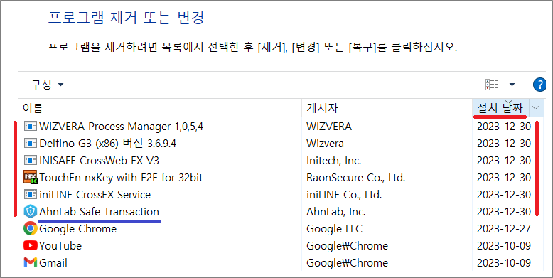 2023-12-30일에 설치한 프로그램들이 국민은행, 신한은행 로그인하면서 설치한 프로그램들입니다.