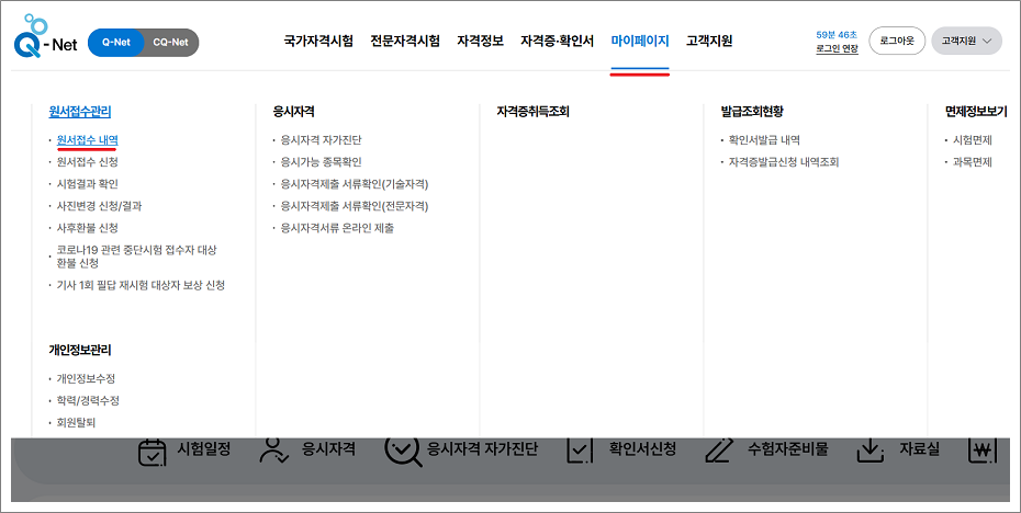 10시 이전에는 국가기술자격 상시시험 접수 메뉴가 표시되지 않고 10시 정각부터 메뉴가 표시됩니다.
