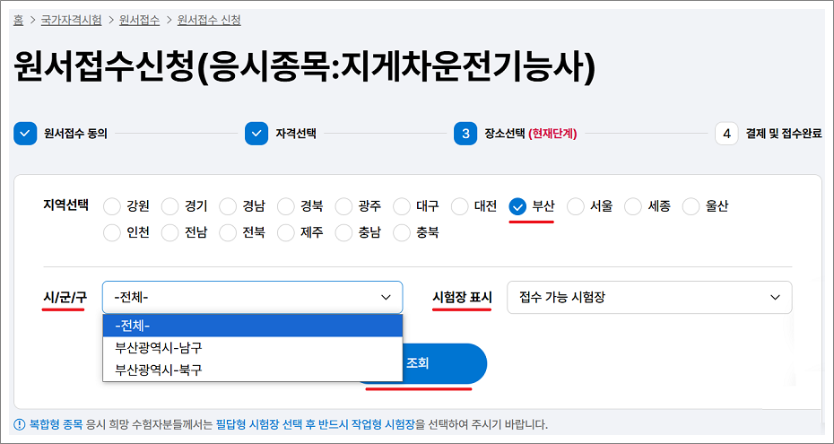 지역에 따라 시험장소가 1군데인 곳도 있고 2개 이상인 곳도 있으니 전체 또는 시/군/구에서 선택해서 조회합니다.