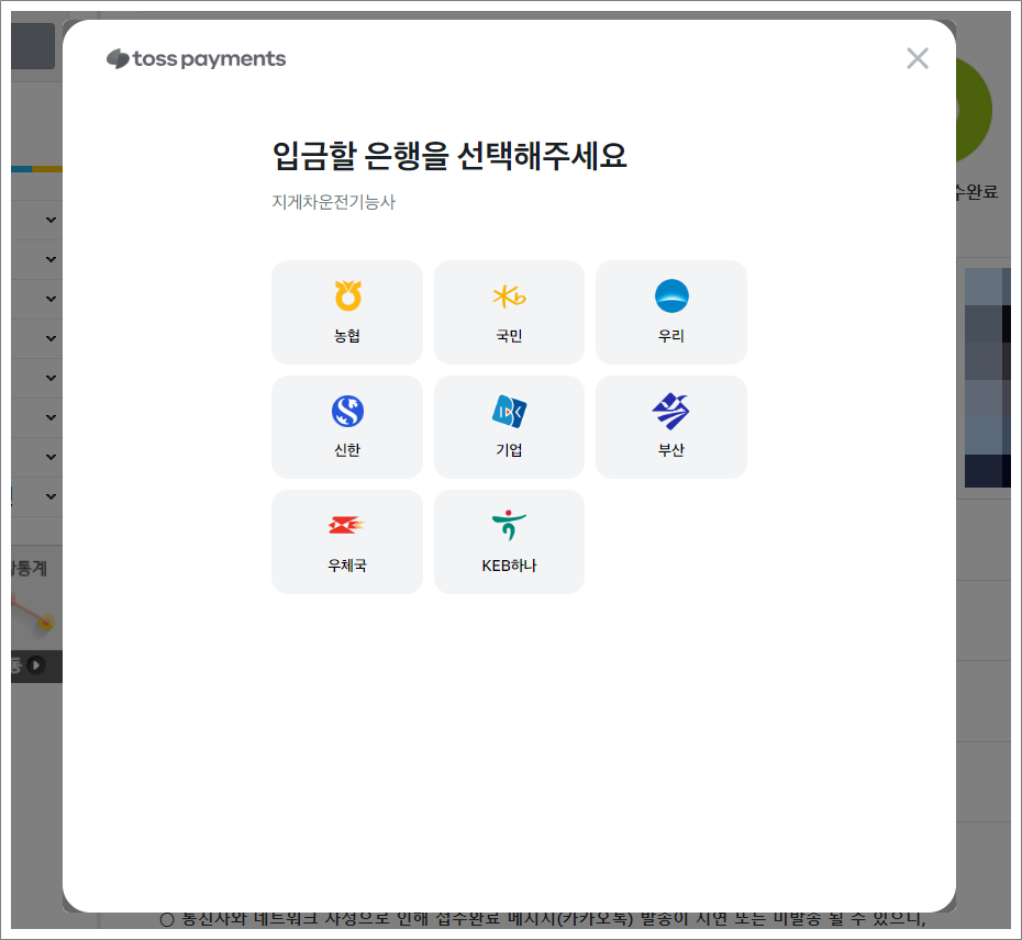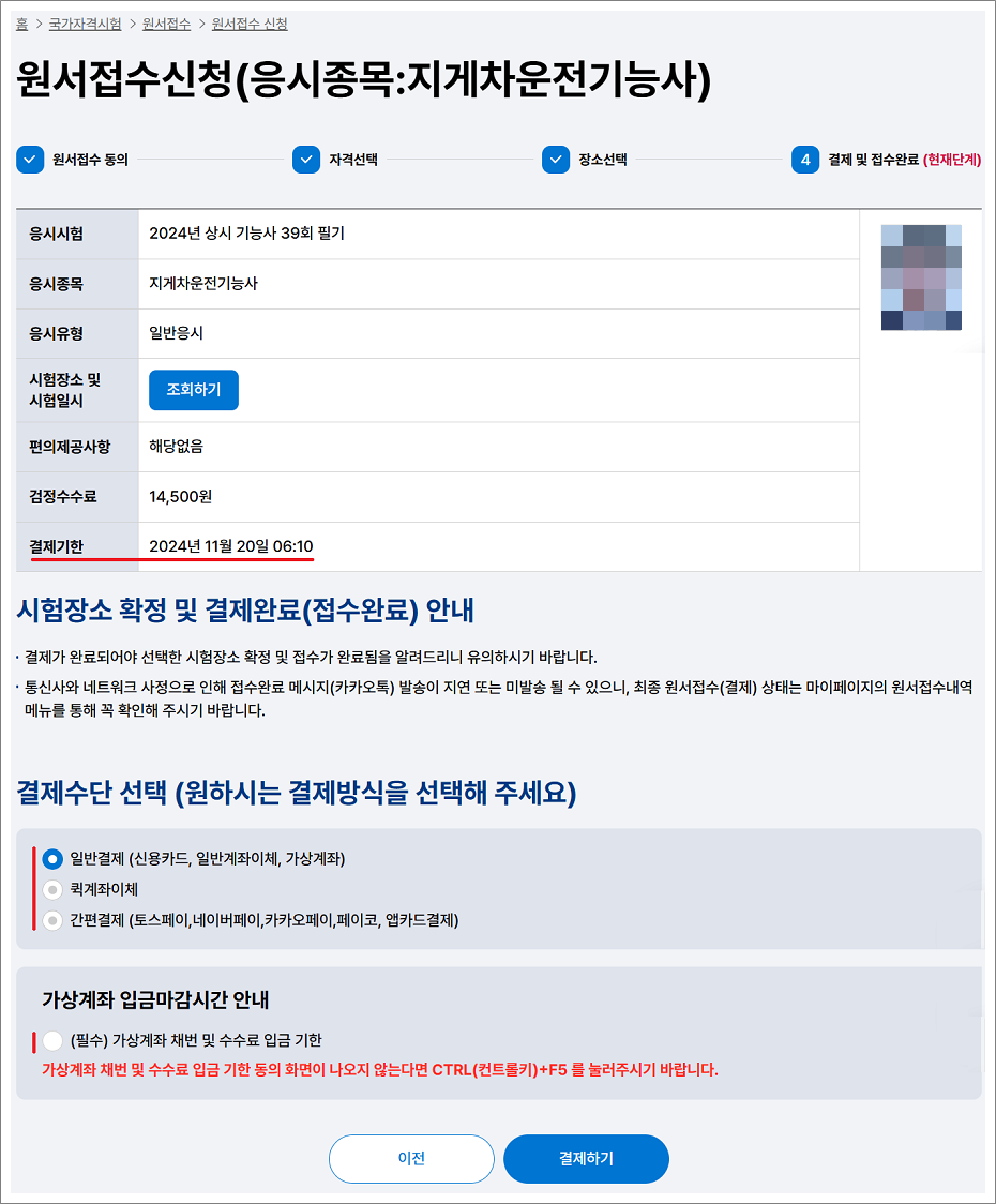 2024년도 이전에는 결제수단을 가상계좌를 이용하면 가장 빨리 지게차 필기 접수 가능했습니다.