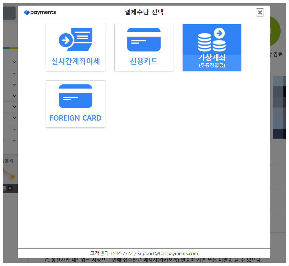 2. 결제수단 선택은 가상계좌를 선택합니다.