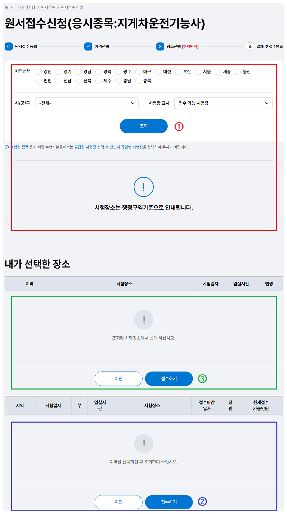 지게차운전기능사 자격증 필기시험 접수 시 시험 장소, 시험 날짜, 시험 시간 선택은 선착순입니다.