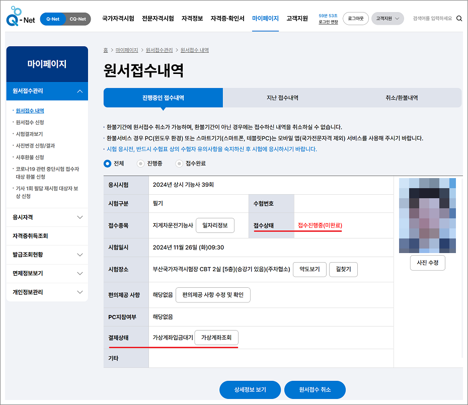 가상계좌로 계좌이체를 하면 1 ~ 2분 후에 결제상태는 결제완료, 접수상태는 접수완료로 변경됩니다.