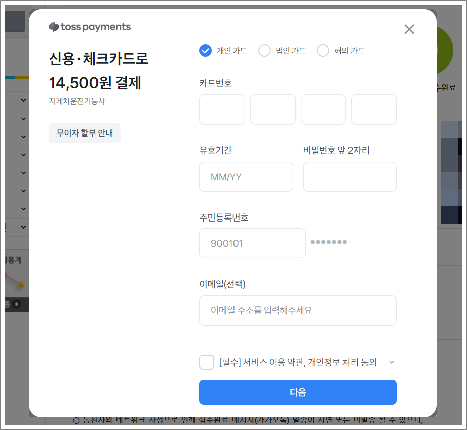 간편결제도 인터넷 쇼핑몰 결제와 동일한 절차와 방법입니다.