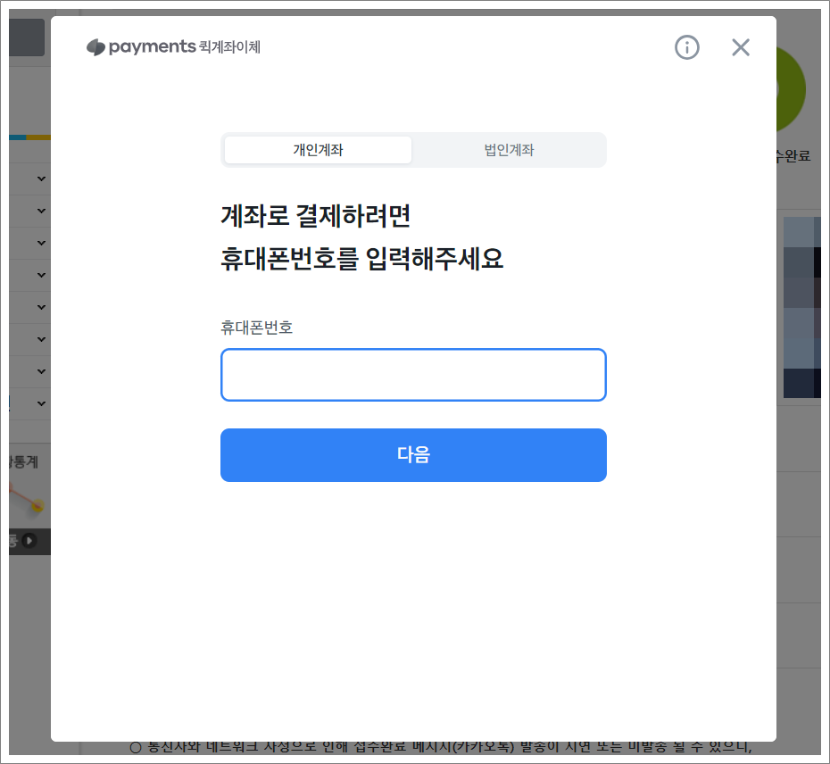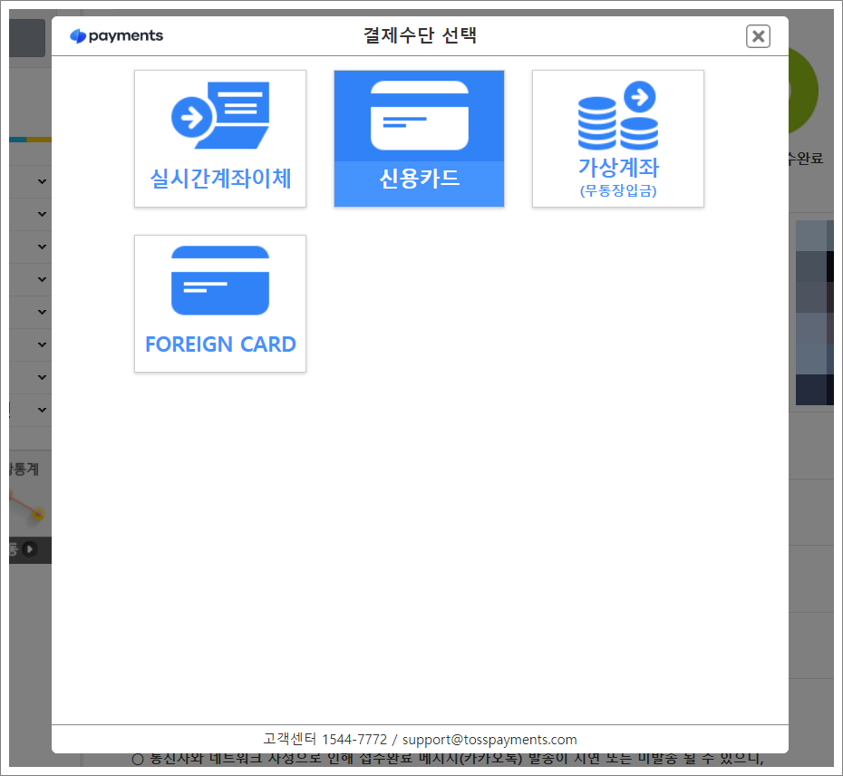 일반결제(신용카드, 일반계좌이체, 가상계좌)는 인터넷 쇼핑몰 결제와 동일합니다.