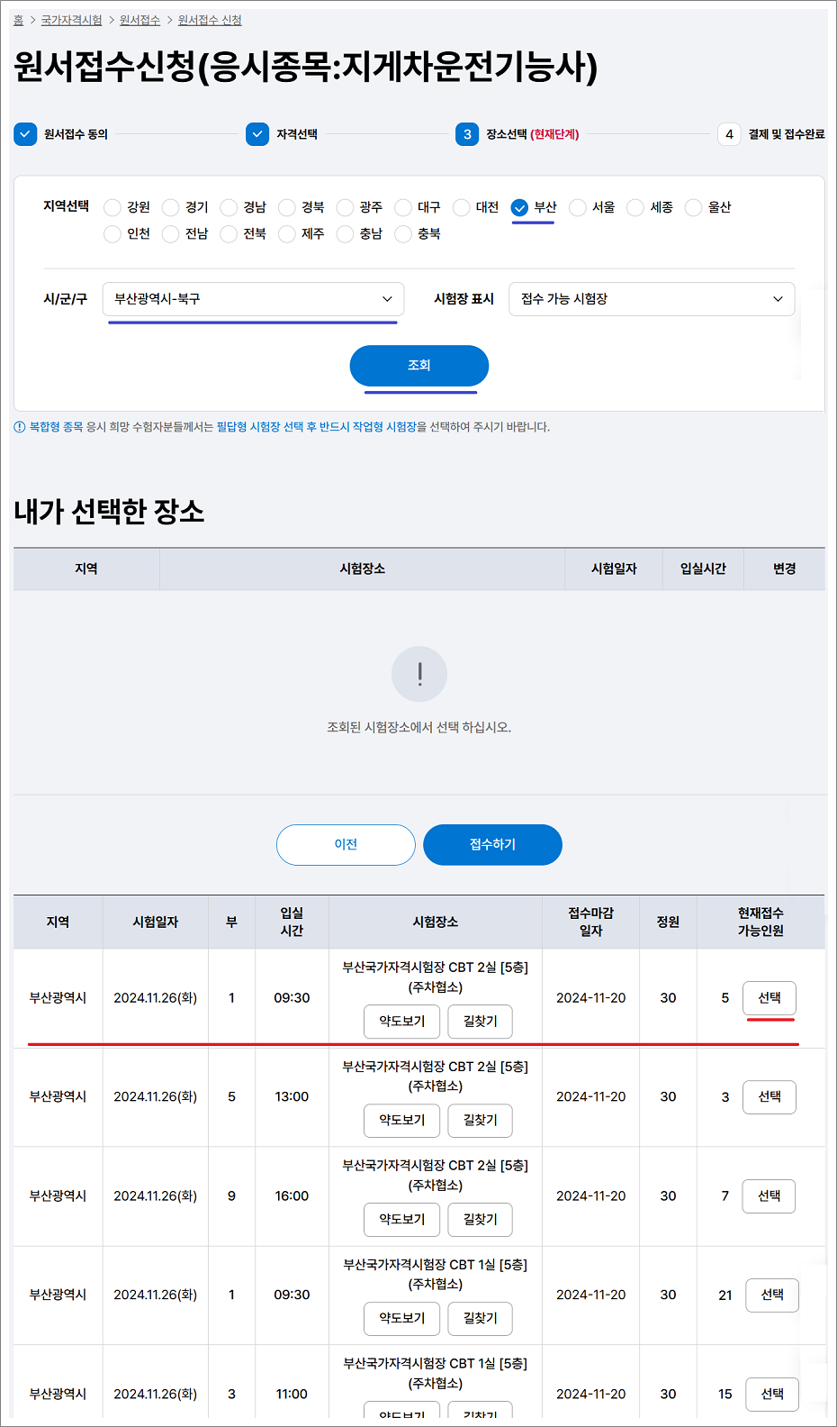 시험장소에 원서 접수 가능한 시험장소, 시험일자, 시험시간, 입실시간이 표시되면 시험장소 선택합니다.(파란 네모)