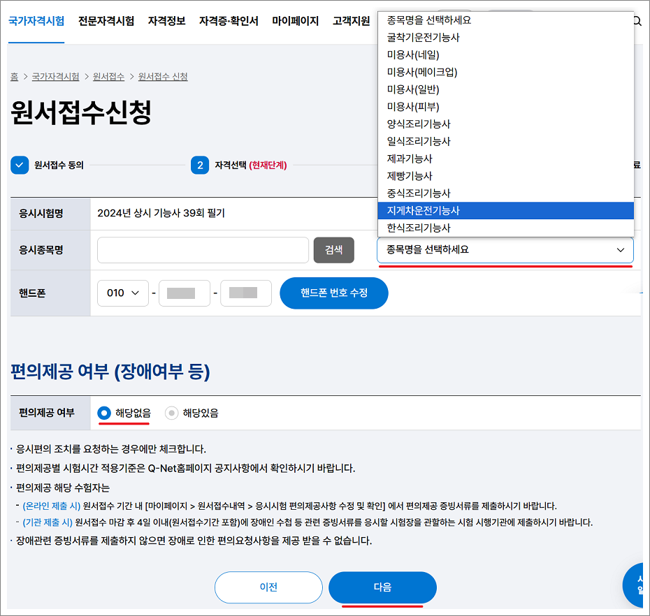지게차운전기능사 필기접수 절차에는 설문 항목 및 다양한 정보를 기입해야 하는 곳이 있습니다.