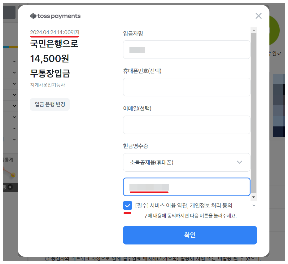 입금자명에서 이름은 자동으로 입력되어 있고 소득공제 부분만 선택하고 확인 선택하시면 됩니다.