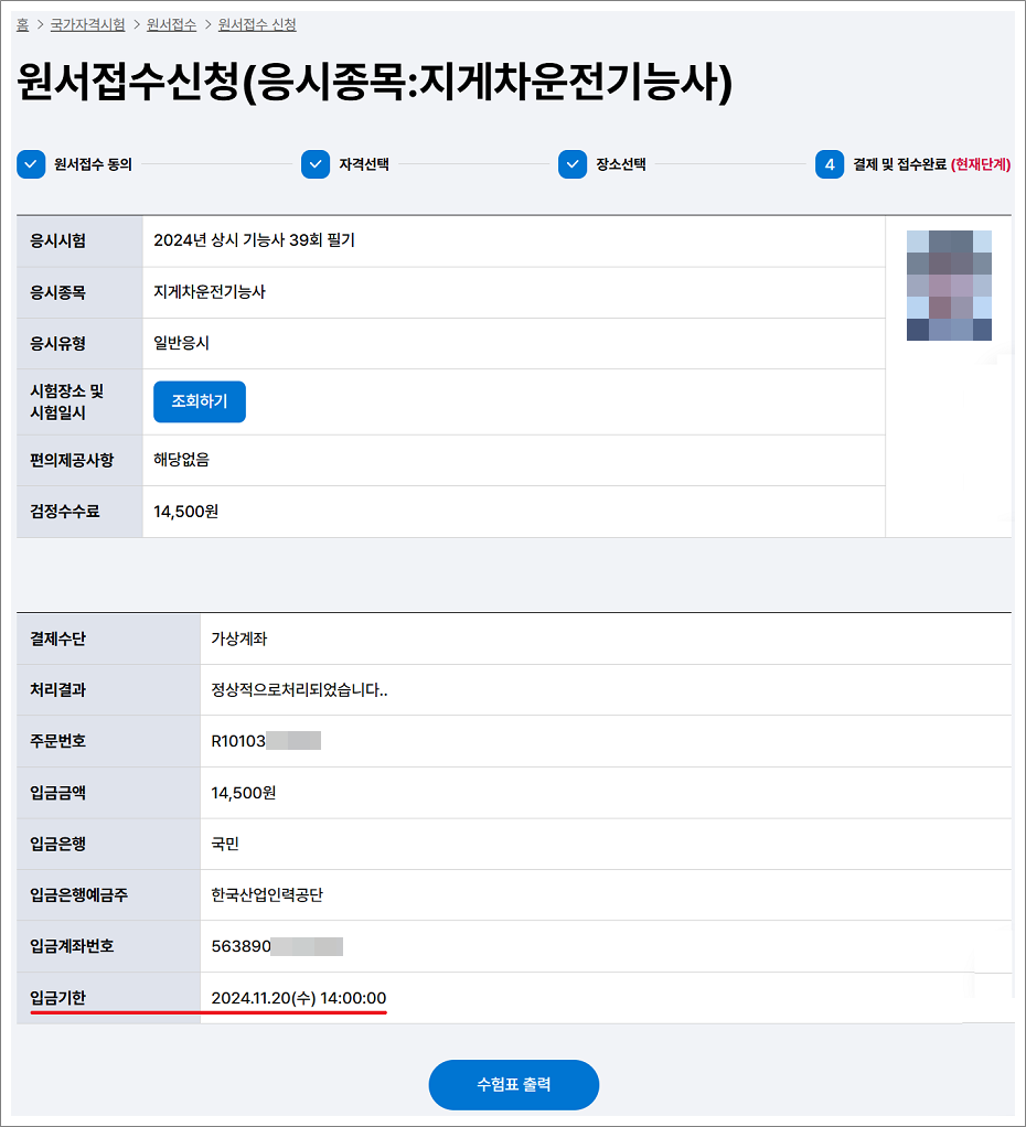 가상계좌 입금기한은 필기 접수시간과 날짜에 따라 다르기 때문에 꼭 결제기한을 확인하시기 바랍니다.