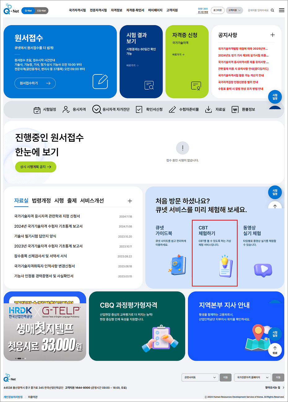 1. 큐넷 Q-ne 첫 화면에서 하단으로 이동해서 CBT 체험하기 선택합니다.