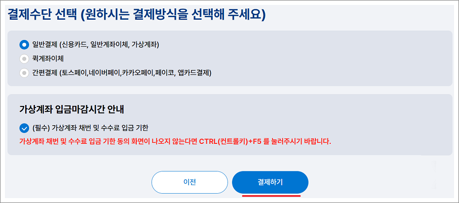 신용카드, 계좌이체는 30분 이내 결제를 해야 하지만 가상결제 수단은 13:00 기준으로 접수 당일 14시, 익일 14시까지 입금하면 되기 때문에 여유 시간이 충분히 있습니다.