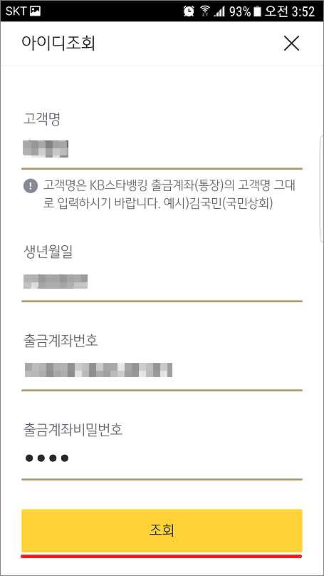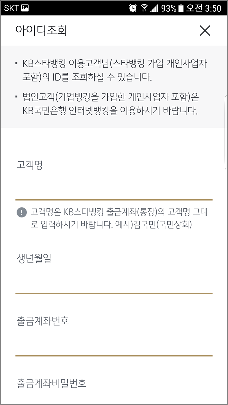 ID 조회에는 국민은행 계좌번호가 필요합니다.