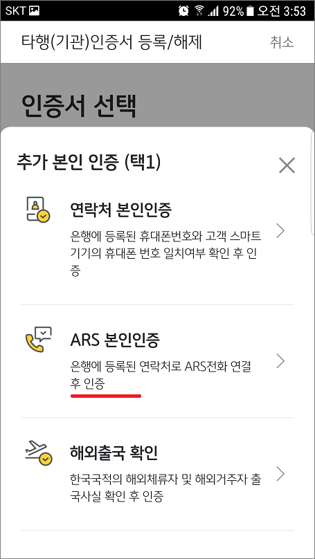 ⑦. 확인. 확인을 선택하면 다른 인증수단 메뉴부터 다시 시작됩니다.