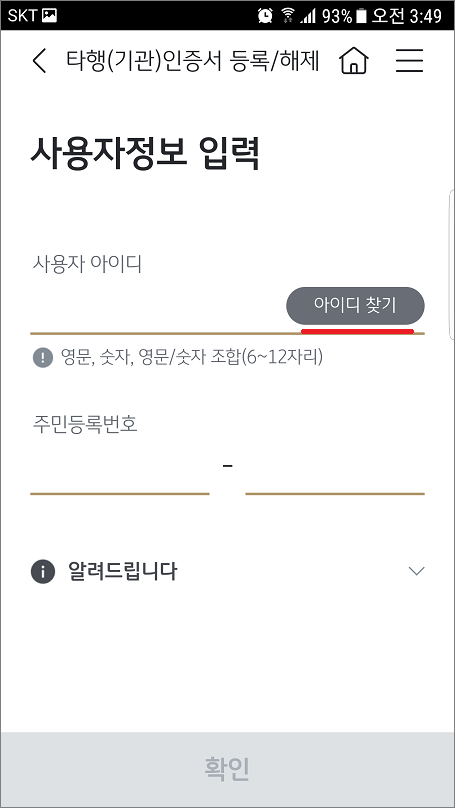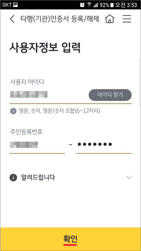 ⑨. 사용자 아이디, 주민등록번호 앞자리 입력하고 확인 선택.
